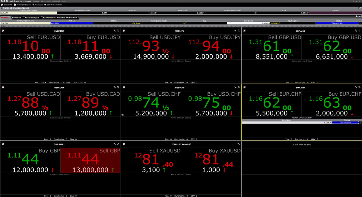 Setzen Sie auf Währungskurse und nutzen Sie dabei unseren FX Trader mit dem direktem Zugang zu Interbank Kursen. Die Veränderungen sind im FX Trader jederzeit ersichtlich. Das Tradingtool lässt Ihnen keine Wünsche offen. Sie haben keine versteckten Kursspreads sowie Aufschläge, dass heisst transparente sowie günstige Provisionen beim traden. Profitieren Sie von den vielen Vorteilen bei meinTrade.ch und dem FX Trader. Als Ihr Onlinebroker bieten wir Ihnen in jedem Bereich die beste Trading Plattform und somit einen Vorteil bei jedem Trade.